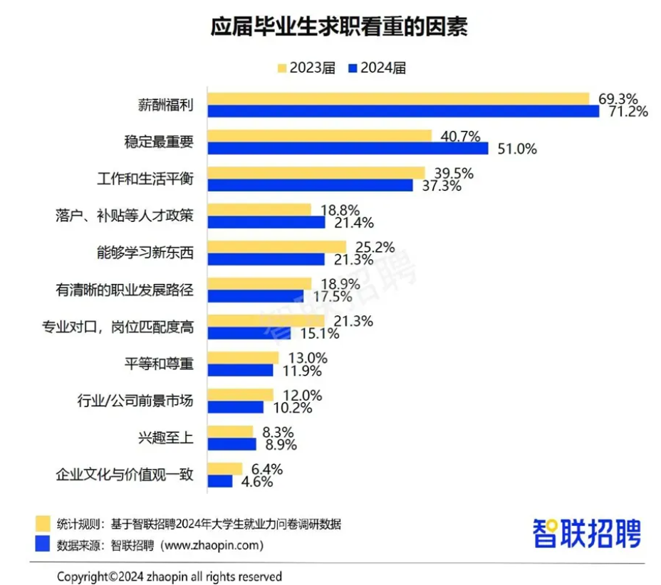 據(jù)統(tǒng)計(jì),近兩年來,應(yīng)屆畢業(yè)生在求職工程中看中的首要因素還是薪酬福利,其次是考慮穩(wěn)定性較高的工作。