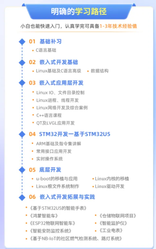 華清遠見推出了一流嵌入式高薪就業課程,為零基礎小白、技術轉型人群、在職提升者還有跨行轉專業的人配置了合適的全流程技術成長路線。