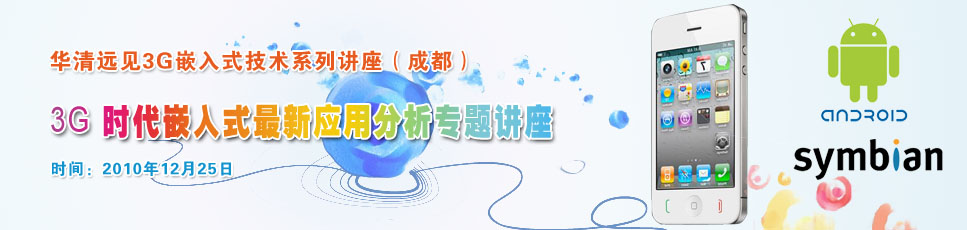 應(yīng)眾多3G移動(dòng)開(kāi)發(fā)專(zhuān)業(yè)人士及技術(shù)愛(ài)好者的要求,華清遠(yuǎn)見(jiàn)兩位業(yè)內(nèi)頂級(jí)專(zhuān)家聯(lián)手通過(guò)對(duì)應(yīng)專(zhuān)題和大家一起分享Symbian、Android的開(kāi)發(fā)重點(diǎn)、技術(shù)難點(diǎn)以及典型應(yīng)用案例,我們希望通過(guò)華清遠(yuǎn)見(jiàn)兩位頂尖行業(yè)專(zhuān)家的精彩演講帶給大家一場(chǎng)別開(kāi)生面的3G移動(dòng)開(kāi)發(fā)饕餮盛宴,歡迎加入我們的經(jīng)驗(yàn)分享之旅!后續(xù)針對(duì)iphone、Windows Mobile的專(zhuān)題也將陸續(xù)推出,敬請(qǐng)期待!