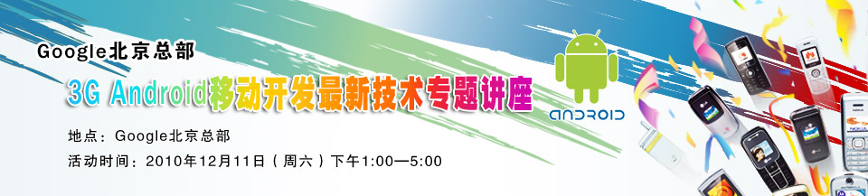 | 北京谷歌技術用戶組將在12月11日(周六)下午1:00—5:00在北京谷歌公司總部舉辦一場3G Android移動開發新技術專題講座活動,培訓講座中將分別通過三個專題與眾多嵌入式開發專業人士及技術愛好者一起分享3G Android移動開發新技術,以大家進入手機開發領域。 |