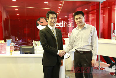 紅帽公司大中華區培訓服務總監黃建耀與華清遠見教育科技集團總裁季久峰共同慶賀合作成功