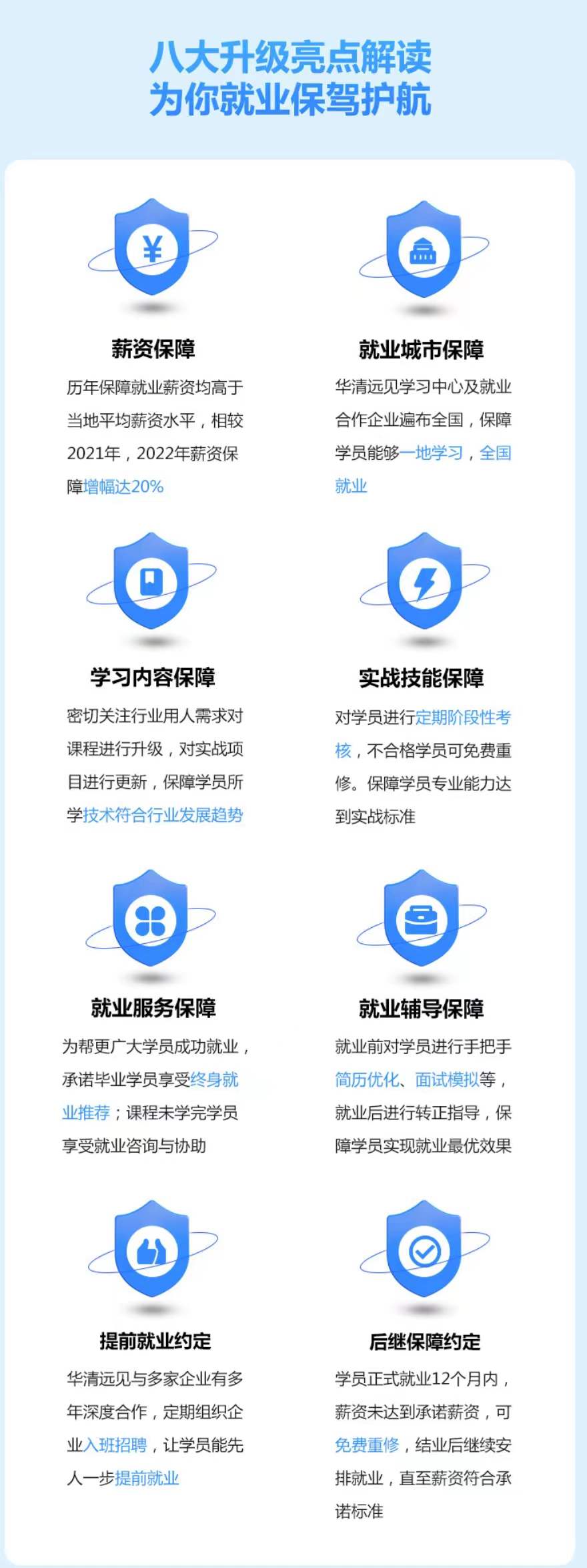 華清遠見注重就業的每一個環節,利用自身資源加強整合多個專業渠道和多種就業模式,其中包含薪資保障、就業城市保障、學習內容保障、實戰技術保障、就業服務保障、就業輔導保障、提前就業約定、后繼保障約定八大內容。華清遠見與多家企業有多年深度合作,密切關注行業用人需求,對課程和實戰項目不斷更新,保障學員所學技術符合行業發展趨勢,打通人才到企業的直接橋梁。