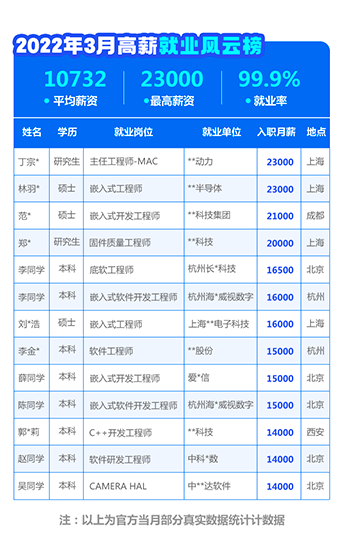 華清遠見在嵌入式行業內有著非常高的行業地位,我們和眾多嵌入式企業都建立有廣泛的用人關系。同時,華清遠見與全國20000+企業展開合作,一方面可以充分了解全國企業實際用人需求,為企業定向培養并輸送高端IT人才;另一方面,將名企技術研發實力與華清遠見人才培養優勢充分整合,將名企技術賦能IT行業人才培養體系。