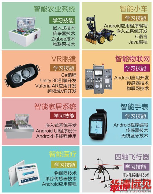 除此之外,華清遠見自主研發的實訓項目還有智能小車、倉儲物聯網系統、四軸飛行器、智能醫療系統、智能農業系統、智能手環、智能手表、智能機頂盒、開源平板電腦等10余款,并已經廣泛到教學環節,自主研發實驗設備達50余套!