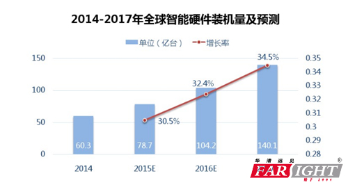 據(jù)相關(guān)數(shù)據(jù)顯示,全球智能硬件總裝機(jī)量呈持續(xù)增長趨勢,2014年全球智能硬件總裝機(jī)量達(dá)到60億太,預(yù)計(jì)2017年將超過140億臺(tái)。