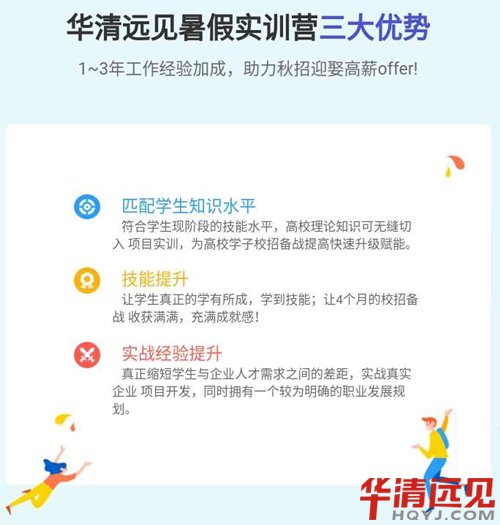 今天帶大家來看一下華清遠見的暑期實訓營。實訓營的優(yōu)勢是:第一,可以真正匹配學生的知識水平,符合學生現階段的技能水平,高校理論知識可無縫切入項目的實訓,為高校學子招備戰(zhàn)提高快速升級賦能。其次,是真正能讓學生學有所成,學習到技能,提升自身技術實力。最后,而且也是最重要的是,真實企業(yè)的大型實訓教學,可以幫助學生真正積累一些企業(yè)級項目開發(fā)的實戰(zhàn)經驗,縮短學生與企業(yè)人才需求之間的差距。