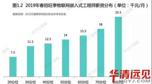我們再看看,物聯網時代產業(yè)背景下嵌入式復合型人才的需求分析。《2018物聯網白皮書》報告,截止2018年中期,我國物聯網產業(yè)總體規(guī)模已達1.2萬億,預計到2020年產業(yè)規(guī)模將會超過1.5萬億元。BOSS直聘平臺數據顯示,2019年春招旺季,物聯網嵌入式工程師人才需求同比增速超過46%,由于人才緊缺程度高于其他技術職位,物聯網嵌入式工程師平均招聘薪酬達到18132元。