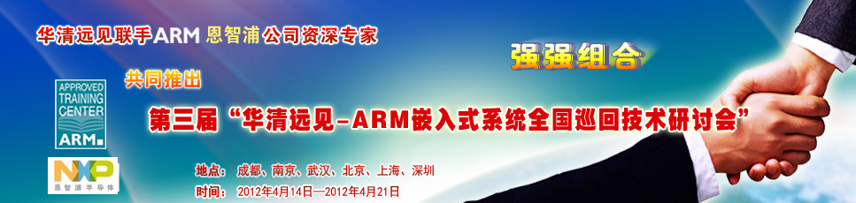從2012年4月14日至2012年4月21日為期一周的時(shí)間,華清遠(yuǎn)見教育科技集團(tuán)攜手全球的半導(dǎo)體知識(shí)產(chǎn)權(quán) (IP) 提供商ARM公司及知名的半導(dǎo)體公司恩智浦半導(dǎo)體NXP Semiconductors N.V.,共同推出主題為“智能化電子產(chǎn)品開發(fā)新趨勢(shì)及基于ARM的嵌入式Linux開發(fā)核心技術(shù)”的全國大型巡回公益技術(shù)講座,分別在華清遠(yuǎn)見成都中心--四川大學(xué)(望江校區(qū))五教101教室、南京中心--漢庭連鎖酒店3樓大會(huì)議室、武漢中心--武漢理工大學(xué)鑒湖校區(qū)鑒二301教室、北京總部--北京市海淀區(qū)北四環(huán)中路238號(hào)柏彥大廈3層301室、上海中心--上海虹漕南路55號(hào)3樓第一教室、深圳中心--深圳大學(xué)科技樓一樓3號(hào)報(bào)告廳隆重舉行,自此由ARM公司及恩智浦公司眾多技術(shù)專家和華清遠(yuǎn)見知名技術(shù)專家聯(lián)袂奉獻(xiàn)的嵌入式系統(tǒng)設(shè)計(jì)主題盛宴圓滿落幕。 本次系列講座分享的主題為:“智能化電子產(chǎn)品開發(fā)新趨勢(shì)及基于ARM的嵌入式Linux開發(fā)核心技術(shù)”,活動(dòng)當(dāng)天,眾多的嵌入式技術(shù)愛好者們都積極踴躍地參與到本次研討活動(dòng)中,整個(gè)會(huì)議中心座無虛席,大家認(rèn)真聆聽ARM公司專家、恩智浦產(chǎn)品專家及華清遠(yuǎn)見嵌入式技術(shù)專家的經(jīng)驗(yàn)分享。