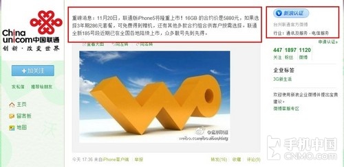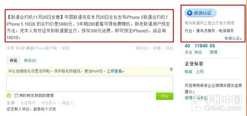 官微:行貨iPhone 5聯通合約機11月20日發售