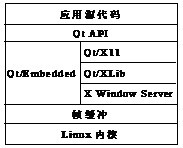 Qt/Embedded以原始Qt為基礎(chǔ),并做了許多出色的調(diào)整以適用于嵌入式環(huán)境。Qt/Embedded通過Qt API與Linux I/O設(shè)施直接交互,成為嵌入式Linux端口。同Qt/X11相比,Qt/Embedded很省內(nèi)存,因為它不需要一個X服務(wù)器或是Xlib庫,它在底層拋棄了X lib,采用framebuffer(幀緩沖)作為底層圖形接口。同時,將外部輸入設(shè)備抽象為keyboard和mouse輸入事件。Qt/Embedde的應(yīng)用程序可以直接寫內(nèi)核緩沖幀,這避免開發(fā)者使用繁瑣的Xlib/Server系統(tǒng)。圖1.1比較了Qt/Embedded與Qt/X11的架構(gòu)區(qū)別。