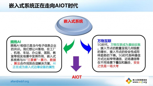 嵌入式系統(tǒng)知名專家、嵌入式系統(tǒng)聯(lián)誼會秘書長何小慶先生發(fā)表了主題為《嵌入式處理器和軟件技術(shù)發(fā)展趨勢》的演講,聲情并茂的為大家講解了嵌入式系統(tǒng)和軟件的四個發(fā)展歷程。他預(yù)測,行業(yè)未來的發(fā)展遠景將是“擁抱AI”和“萬物互聯(lián)”。物聯(lián)網(wǎng)時代的崛起催生出物聯(lián)網(wǎng)操作系統(tǒng),將繼而衍生出AI芯片。因此,LoT原有系統(tǒng)將面臨大考,功能安全和信息安全成為最重要的課題。