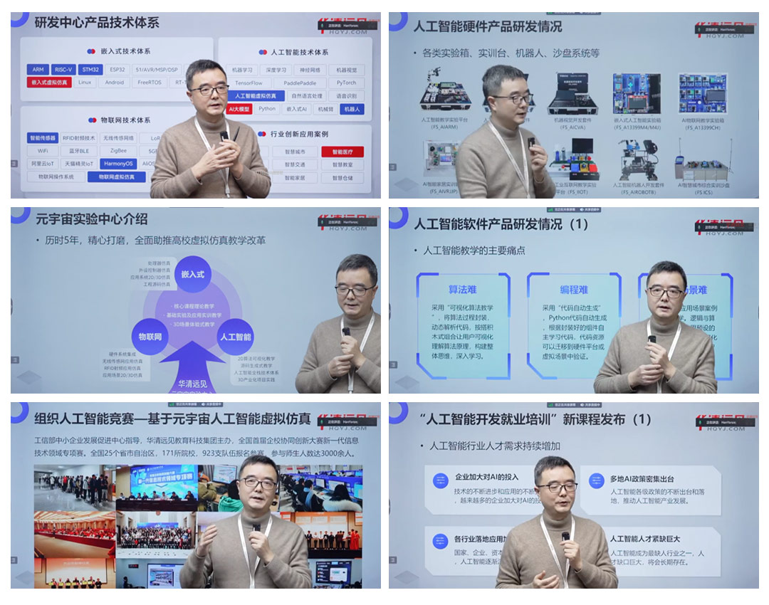 在開班典禮上,華清遠見教育科技集團研發副總裁劉洪濤老師做了開班致辭,回顧了華清遠見在人工智能教學方向的一些研發積累及教學應用,以及目前正在開展的一些教研工作。