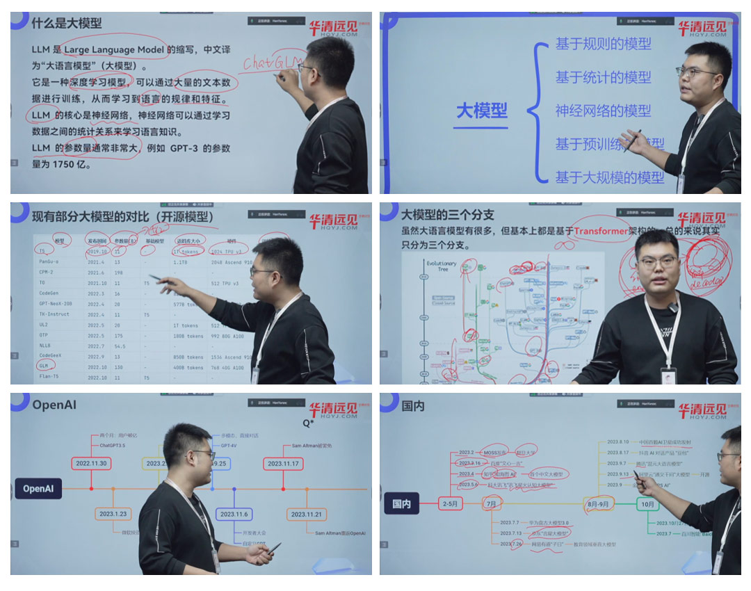 華清遠見研發中心人工智能技術主管韓雁澤老師,以“大模型的前世今生”、“巨頭們的PK”為主題,從市場大宏觀的角度進行了精彩演講,拉開了整個AI大模型師資班的序幕。從大模型的幾個發展階段、現有部分大模型的對比、大模型的三個分支、到OpenAI/微軟/谷歌/Meta以及百度/知乎/科大訊飛/華為/京東/網易/抖音/騰訊/阿里云等國內外巨頭們,帶領高校老師回顧了過去幾年里大模型的一個技術發展及市場競態。從大模型的一個軍備競賽的PK,到未來大模型的產品化、應用化、生活化落地,AI大模型將引領一個充滿機遇與挑戰的時代。