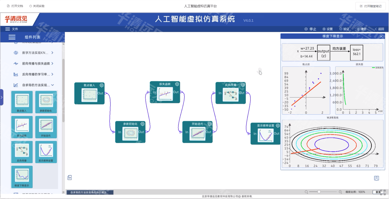 人工智能虛擬仿真系統,自2021年推出以來,已經歷過4個大版本的迭代升級。作為高校人工智能教學輔助工具,虛擬仿真的交互性教學模式,為高校老師人工智能教學工作提供了開創性的教學改革方案。人工智能虛擬仿真軟件的最大優勢,在于解決高校AI教學的三大痛點:算法難、編程難、應用場景難。