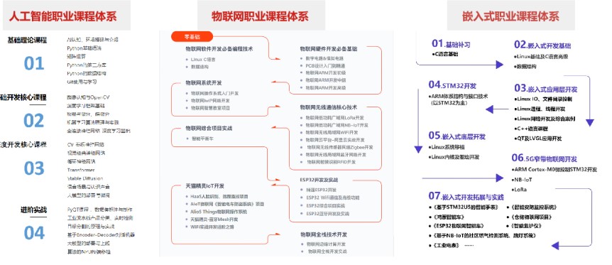 嵌入式、人工智能、物聯網成為智能時代三大主流技術體系,從基礎到進階,結合創新的軟硬件教學平臺及企業落地實戰項目,鍛造符合時代發展的高質量人才。全國13大校區嚴選200多位業內資深講師,線上線下同步授課,全方位將學員培養成為符合當下企業需要的高質量復合型人才。