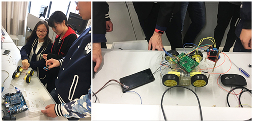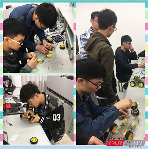 時間過得很快,轉眼間,已經到了做項目的環節了,這次的項目是智能小車,華清遠見為大家提供了實驗器材和小車的零部件,大家在吳老師的帶領下,一步一步終于將小車組裝好,并可以通過手機遙控小車行駛了,雖然這只是一個比較小型簡單的智能小車,但是這種真正動手操作的過程是寶貴的,當同學們用手機遙控小車運行時,大家都很開心。