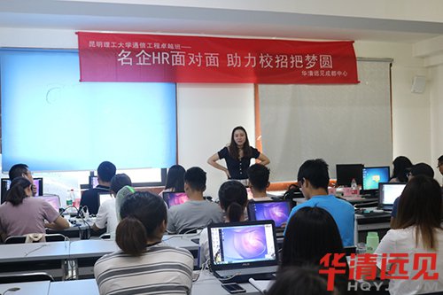 針對大學生就業的問題,2019年6月29日上午9點半,華清遠見成都中心特意為昆明理工來實訓的學生開展了一場名企HR面對面,助力校招把夢圓的座談會。活動特別邀請了中軟國際有限公司的人事經理劉老師以及成都摩勒普科技有限公司的人事經理周老師與同學們面對面進行互動交流,解答了同學們關于校招、就業、面試等相關疑問。