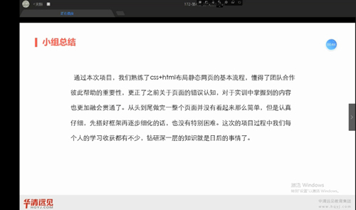 本次實訓項目是《包含html+css+js(jQuery)的網頁前端開發項目》,由華清遠見成都中心李老師教學,并配備了項目經理和教務管理人員,在華清遠見自主研發的在線教育平臺——華清創客學院上進行直播教學,學子們感受到了全面、專業的線上學習體驗,學習熱情始終飽滿,學習效率和成果也同樣優秀!