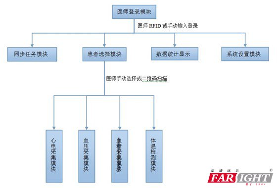 1、條形碼掃描模塊 2、體溫檢測模塊 3、心電檢測模塊 4、血糖檢測模塊 5、血壓檢測模塊