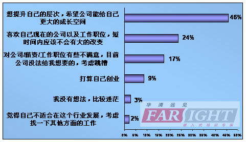 在???未來職業人生的規劃調查????70%的工程師給予了肯定的評價,其??46%的工程師表示想提升自己的層???,希望??前所在公司能給自己更大的成長空間??24%的工程師表示喜???自己現在的??司以及工作職位,??時間內應該不會有較大的改變。考慮跳槽的工程師所占比例為17%,打算自己創業的??9%,其他選項均占較小比例??