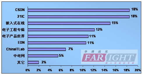 由圖表中??以看出, 在嵌入式工程師經常關顧的網站??,CSDN??21IC所占的比例大,均為18%,而嵌入式在線、電子工程專輯、電子產品世界、EDN、IT實驗室所占比例均??10%左右??