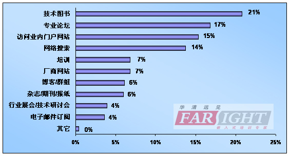 此項調查數據顯示,“技??圖書、專業???壇、業內門戶網站、搜索引擎”是嵌入式工程師獲取知識的主要途徑(接??70%),其中各項所占比例分????21%??17%??15%??14%,網絡已經成為工程師獲取專業知識的主要途徑。除了以??4大途徑外,部分工程師也會通過培???、廠商網站、博??/群組、雜??/期刊/報紙、???業展會/技??研???會以及電子??件???閱等途徑獲取信息。華清遠見提供的免費電子圖書、??????教程等資料每年下載次數已達到十多萬??