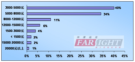 調查數據顯示,月??在??3000-5000元”和??5000-8000元”的工程師所占的比例大,分別??40%??34%,占總參與調研人數的絕大部分??74%),月薪??5000-8000元”的??11%,其它高??以及低薪所占比例均較小。可以看出,嵌入式從業人員薪資待遇相比其他???業高些,一??從剛入???到工作一兩年左右,薪資就??以達??3000-8000??/月之間,而具備???年工作經驗的嵌入式開發工程師月薪則可達到8000-20000??/月,嵌入式從業人員薪資???長空間較大??