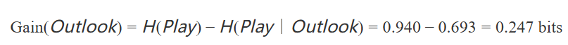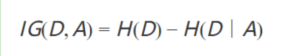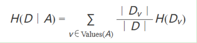 其中,H(D∣A)是在特征 A 的條件下的條件熵,Values(A)是特征 A 的所有取值,DvDv是 在特征 A的取值 v上的數據子集,∣Dv∣和 ∣D∣分別是數據子集 Dv和數據集 D的大 小。