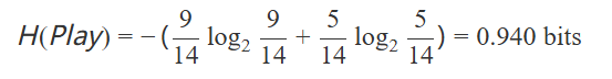 首先,我們計算整個數據集的信息熵(原始狀態的信息量):數據集包含14個實例,其中9個正例(yes)和5個負例(no)。