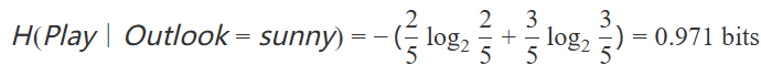 1. 對于Outlook=sunny,有5個實例,其中2個正例和3個負例: