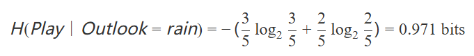 3. 對于Outlook=rain,有5個實例,其中3個正例和2個負例: