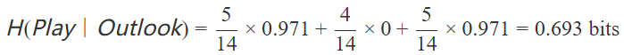 接下來,我們使用Outlook屬性來劃分數據集,并計算劃分后的信息熵。Outlook屬性有三個取值:sunny、overcast和rain。