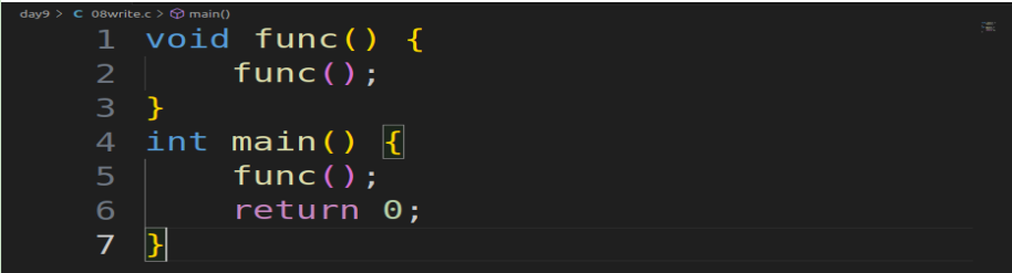 這個func函數會無限遞歸,每次調用都會將函數的返回地址、局部變量等信息壓入棧中。棧空間是有限的,最終就會導致棧溢出。