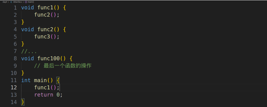 在這個代碼中,從func1到func100層層嵌套調用,可能會因為棧幀的過度積累而導致棧溢出。