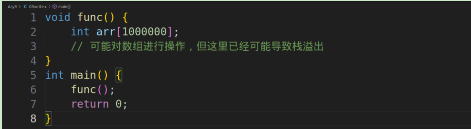 如果在函數內部定義了過大的局部變量數組,而棧空間不足以容納這些變量時,就會出現棧溢出(棧大小限制是 8192 字節)。