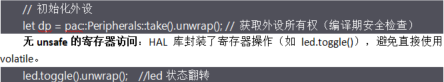 所有權機制:Peripherals::take() 確保外設全局唯一,防止多位置誤操作。