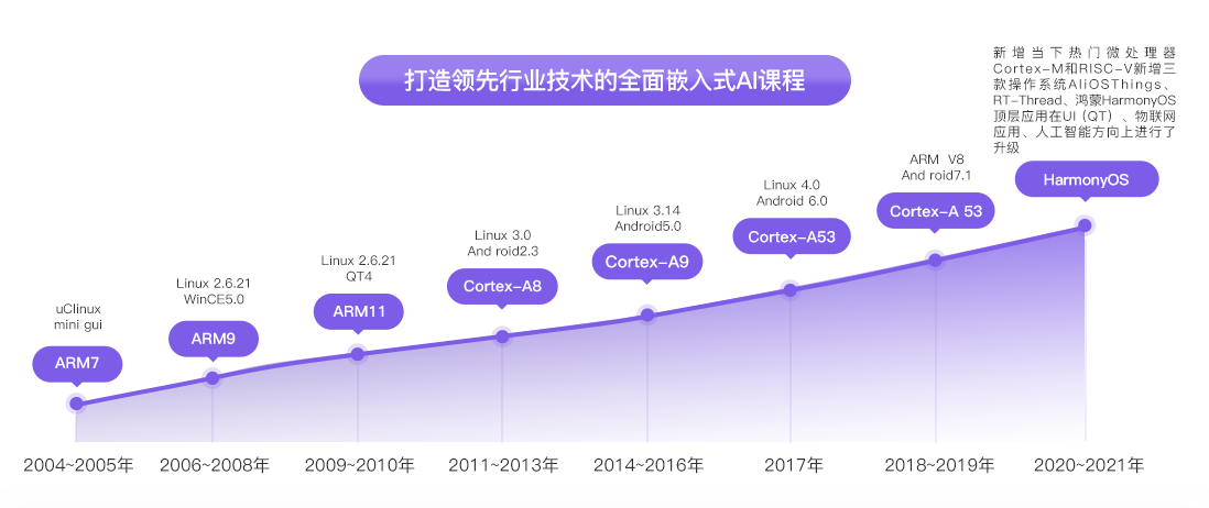 第四代課程在原有Cortex-A、Cortex-M的基礎上新增了RISC-V微處理器。得以實現(xiàn)更多的實戰(zhàn)項目處理,填補了市場上這一處理器學習的空白。